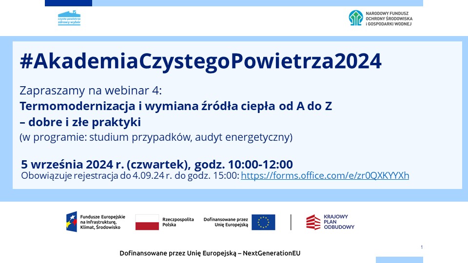 #AkademiaCzystegoPowietrza2024 – 5 września o godz. 10:00. Zapraszamy na 4. webinar o termomodernizacji i audycie energetycznym w programie „Czyste Powietrze”