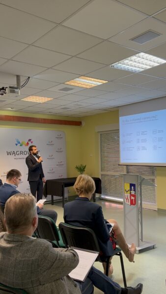 Na zdjęciu sala wypełniona ludźmi, którzy siedzą na krzesłach, a na przodzie sali stoi jedna osoba na tle banerów reklamowych i omawia przedstawioną na ekranie prezentację.