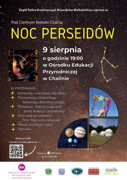 Ośrodek Edukacji Przyrodniczej w Chalinie serdecznie zaprasza na wyjątkowe wydarzenie z okazji Nocy Perseidów, które odbędzie się 9 sierpnia 2024 r. o godzinie 19.00. W programie wydarzenia przewidziane są konkursy i warsztaty plastyczne oraz wspólna obserwacja Perseidów. Na uczestników czeka także prezentacja Globalnego Teleskopu Astrofizycznego połączona z prelekcją astronomiczną. Dla miłośników kina przygotowany został seans pod gwiazdami z filmem fabularnym nawiązującym do tematyki kosmicznej. Będzie również możliwość obserwacji nocnego nieba przez teleskop, co pozwoli na jeszcze bliższe poznanie tajemnic kosmosu.