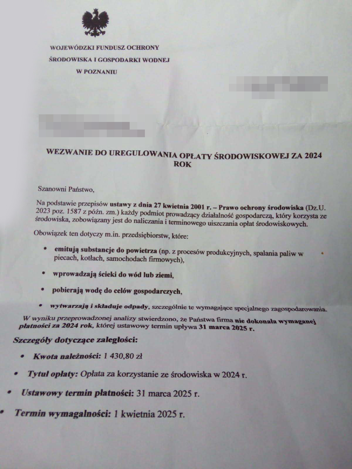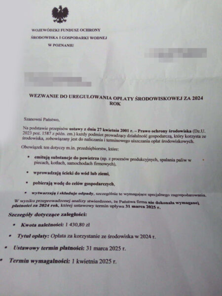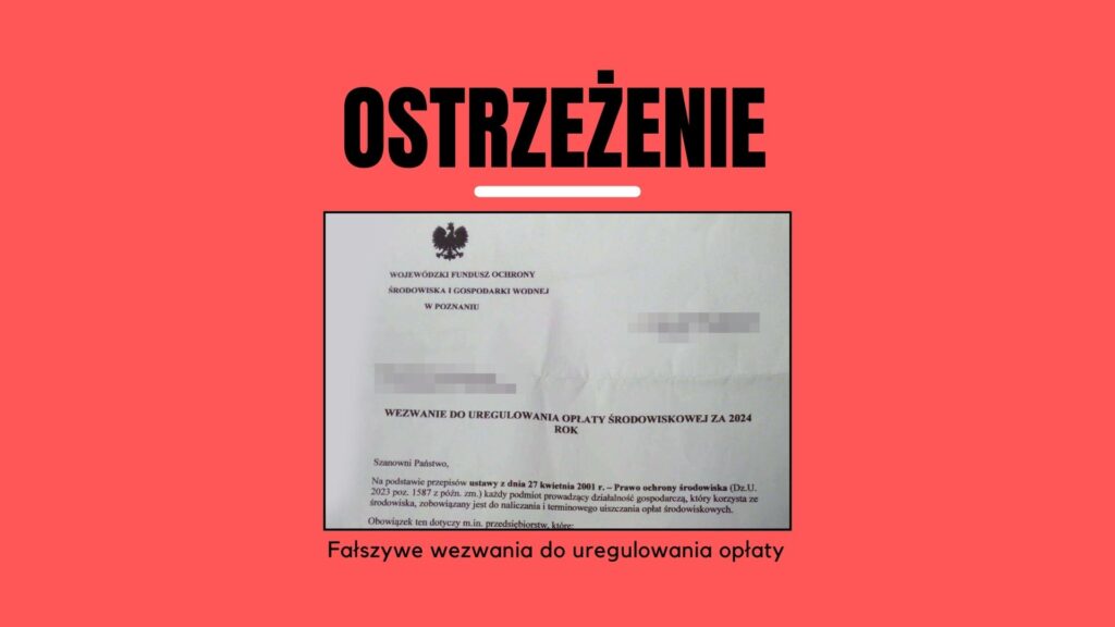 W związku z napływającymi sygnałami od przedsiębiorców z regionu Wielkopolski informujemy o pojawieniu się fałszywych pism, które rzekomo dotyczą wezwania do uregulowania opłaty środowiskowej za 2024 rok. Wiadomości te są rozsyłane przez nieuprawnione podmioty podszywające się pod Wojewódzki Fundusz Ochrony Środowiska i Gospodarki Wodnej w Poznaniu. Ich celem jest wyłudzenie środków finansowych od przedsiębiorców, którzy mogą błędnie uznać te wezwania za oficjalne.