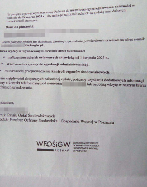 Wojewódzki Fundusz Ochrony Środowiska i Gospodarki Wodnej w Poznaniu ostrzega przed oszustami, którzy wysyłają fałszywe pisma z wezwaniami do uregulowania opłaty środowiskowej za 2024 rok.