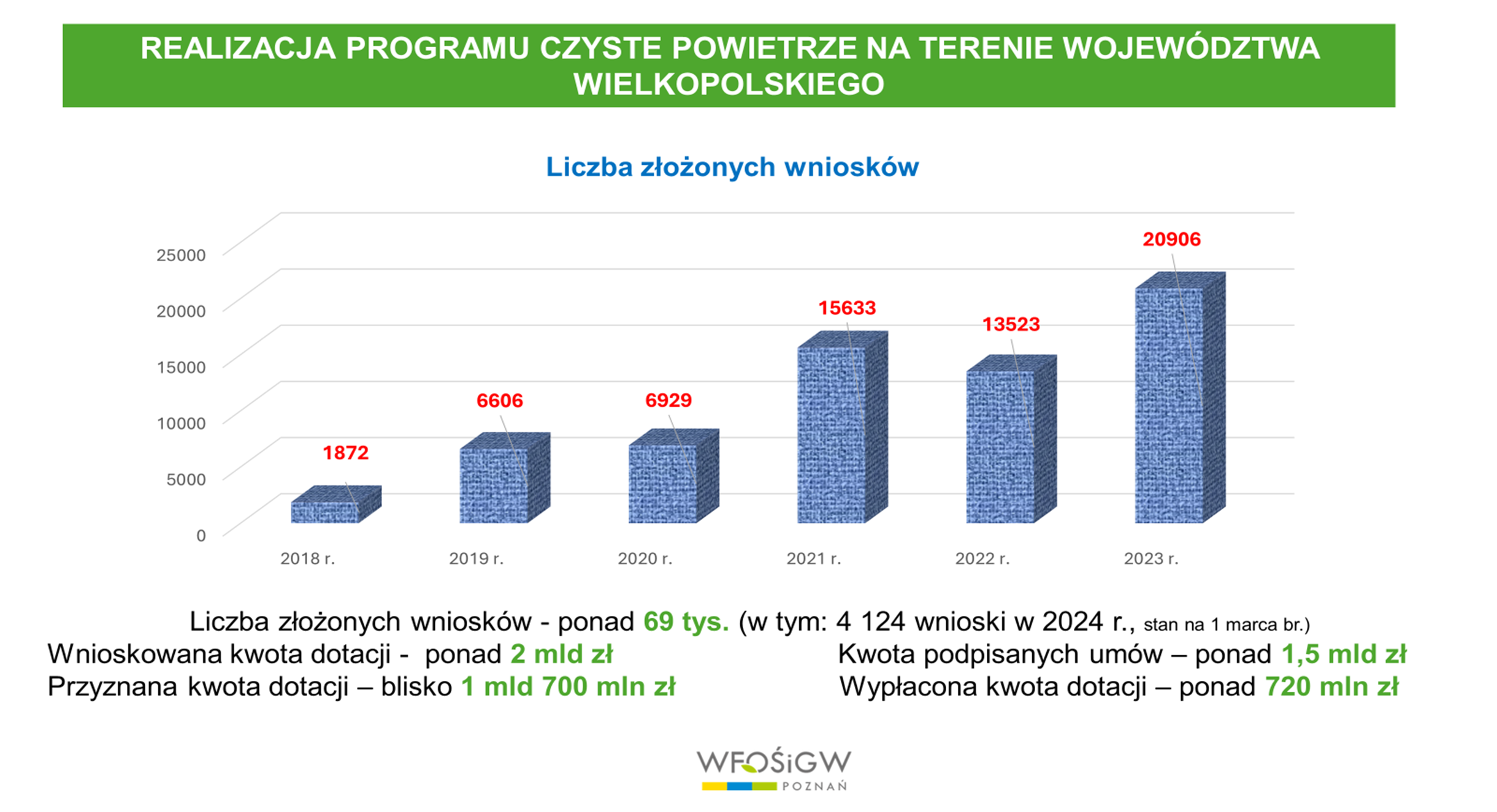 Rok 2024 przyniósł już na samym początku rekordową ilość wniosków o dofinansowanie, które zostały złożone do WFOŚiGW w Poznaniu, których łączna liczba przekroczyła już 69 tys. W samym 2024 r., zgodnie z danymi na dzień 1 marca br. do Funduszu wpłynęło 4 124 wniosków o dofinansowanie.