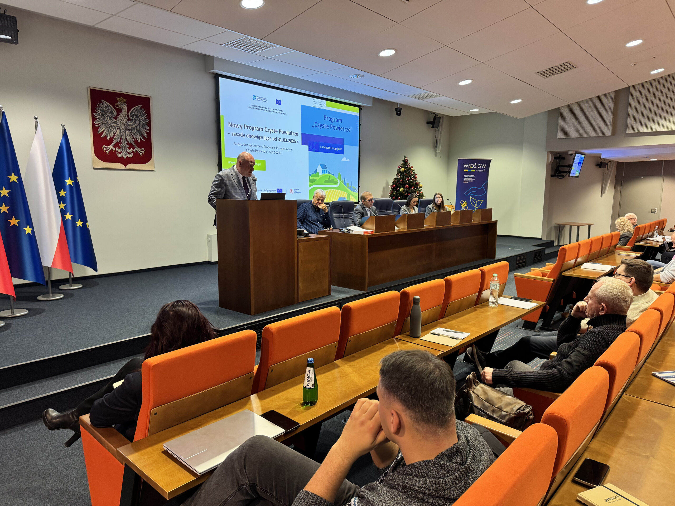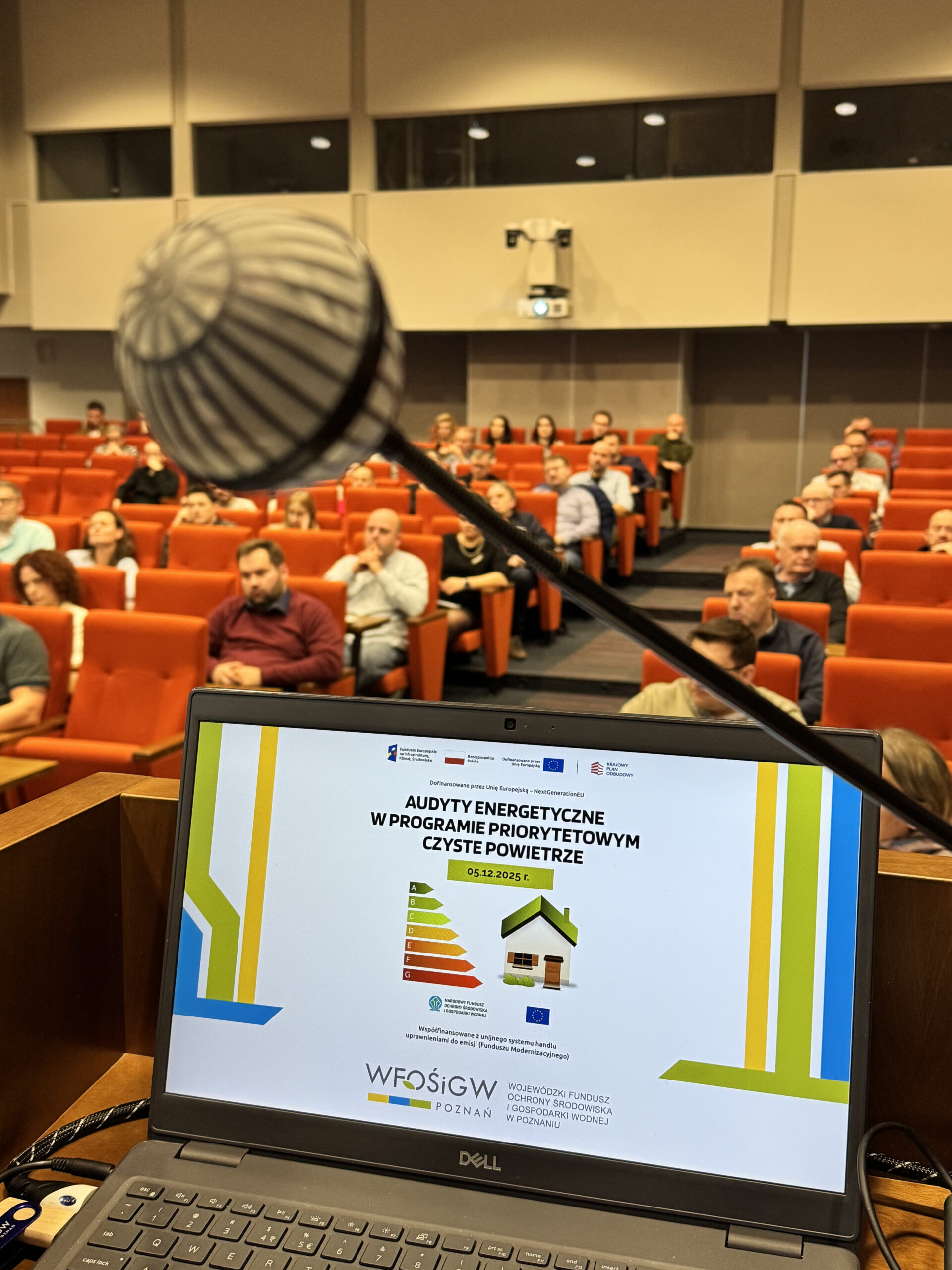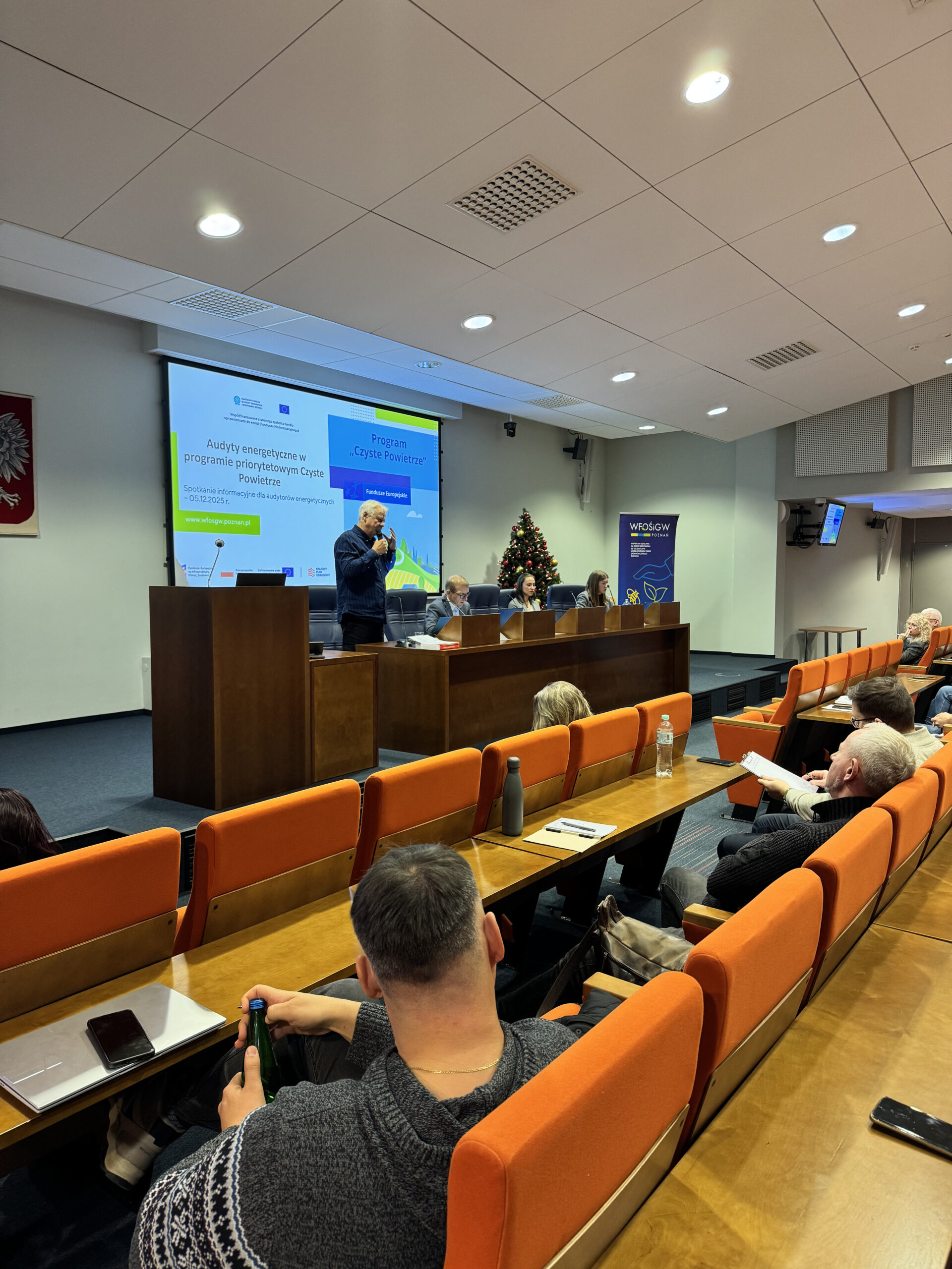 W piątek, 5 grudnia 2025 r., odbyło się spotkanie informacyjne dla audytorów energetycznych wykonujących audyty do Programu Czyste Powietrze, zorganizowane przez WFOŚiGW w Poznaniu. Z uwagi na duże zainteresowanie wydarzenie odbyło się w sali sesyjnej Wielkopolskiego Urzędu Wojewódzkiego.