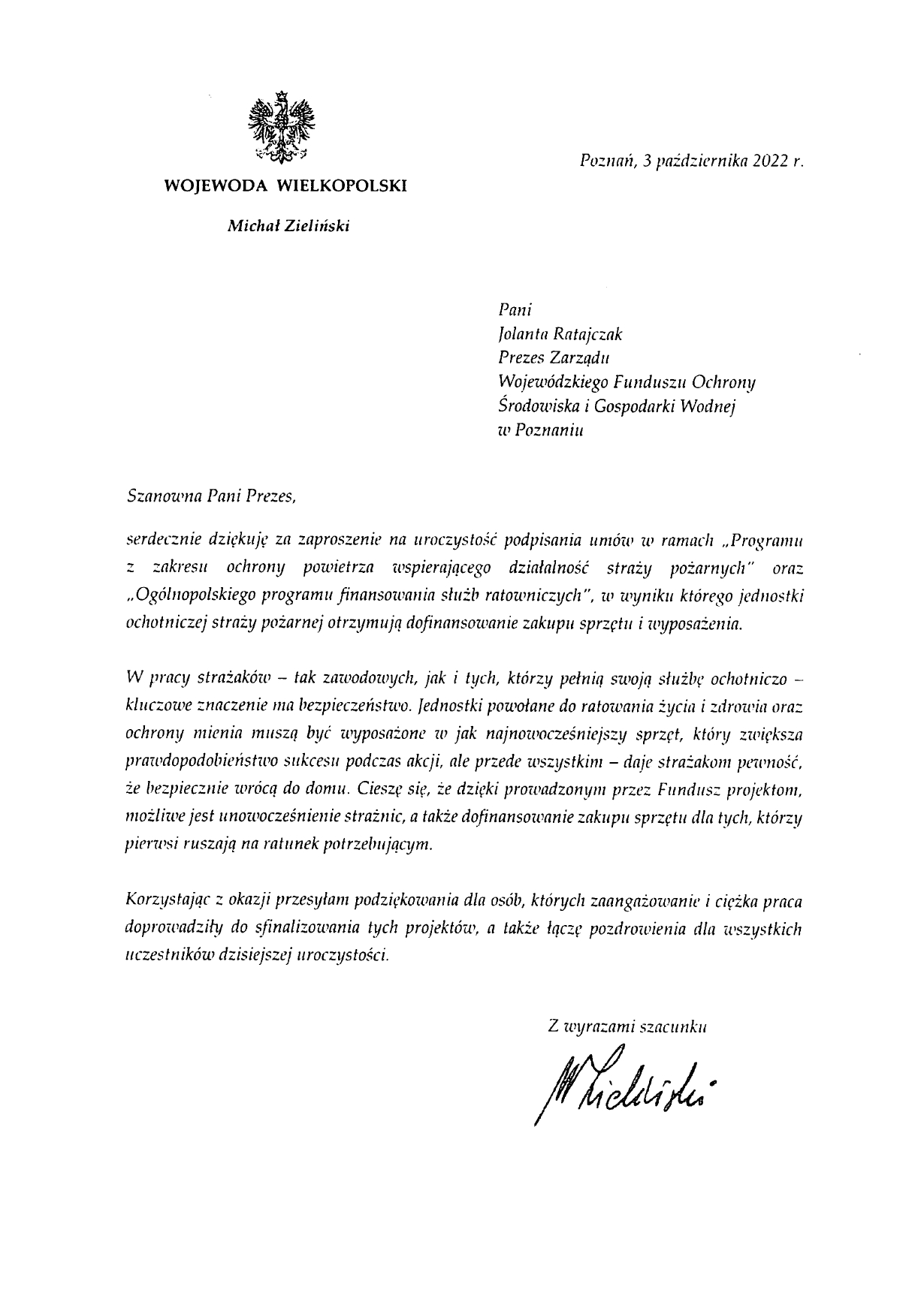 Wojewoda Wielkopolski, Pan Michał Zieliński nie mógł wziąć udziału w uroczystości osobiście, ale przesłał do odczytu list, który zamieszczamy poniżej.