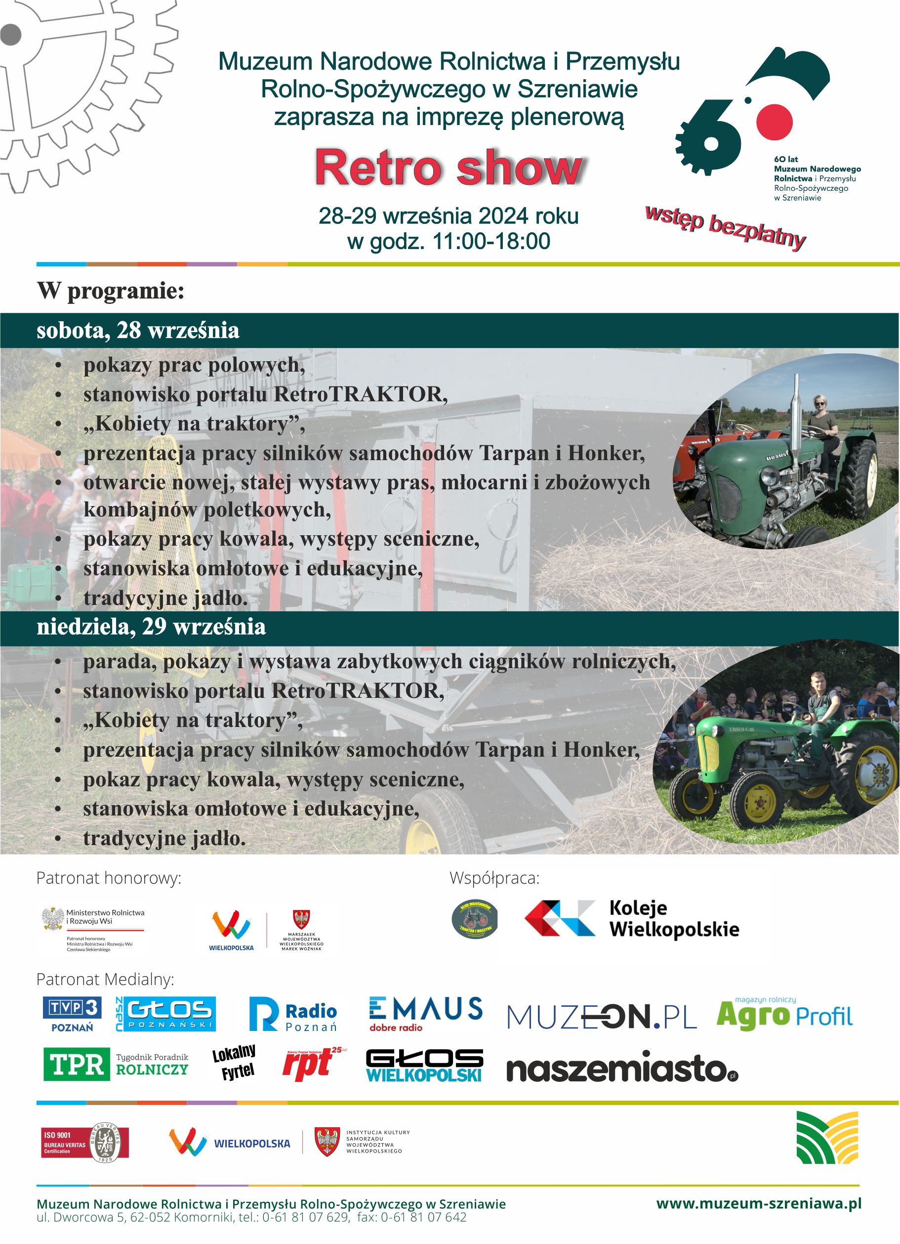 Więcej informacji na stronie Muzeum Narodowego Rolnictwa i Przemysłu Rolno-Spożywczego w Szreniawie: IMPREZA PLENEROWA „RETRO SHOW” 28-29 WRZEŚNIA 2024 ROKU – Muzeum Szreniawa (muzeum-szreniawa.pl)