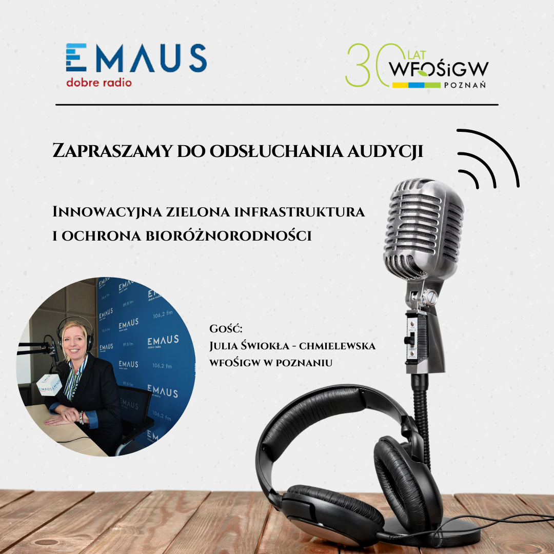 Gościem redaktor Alicji Dec była nasza koleżanka Julia Świokła-Chmielewska z Działu Edukacji Przyrodniczej, która opowiedziała o szczegółach naboru wniosków na przedsięwzięcia z zakresu „Innowacyjnej zielonej infrastruktury i ochrony bioróżnorodności”, który aktualnie prowadzony jest przez Wojewódzki Fundusz Ochrony Środowiska i Gospodarki Wodnej w Poznaniu.