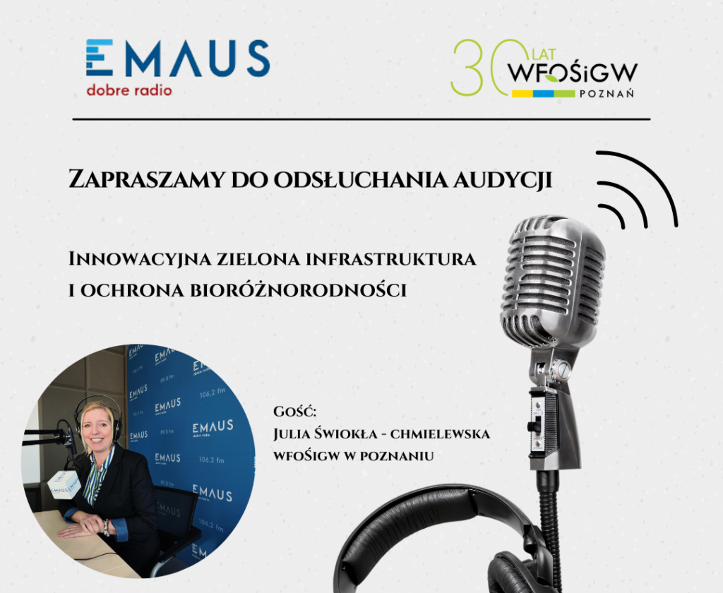 Gościem redaktor Alicji Dec była nasza koleżanka Julia Świokła-Chmielewska z Działu Edukacji Przyrodniczej, która opowiedziała o szczegółach naboru wniosków na przedsięwzięcia z zakresu „Innowacyjnej zielonej infrastruktury i ochrony bioróżnorodności”, który aktualnie prowadzony jest przez Wojewódzki Fundusz Ochrony Środowiska i Gospodarki Wodnej w Poznaniu.