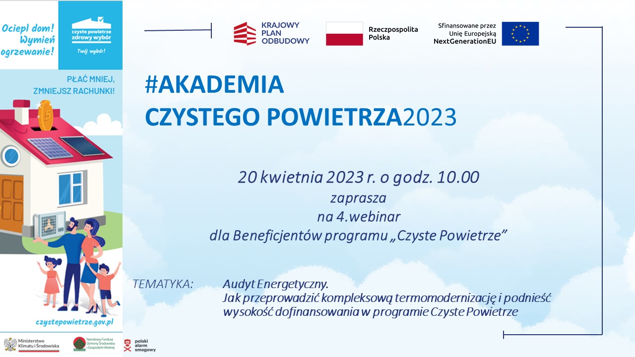 Serdecznie zapraszamy na kolejne już spotkanie szkoleniowe organizowane w ramach Akademii Czystego Powietrza na temat: Audyt Energetyczny. Jak przeprowadzić kompleksową termomodernizację i podnieść wysokość dofinansowania w programie Czyste Powietrze?