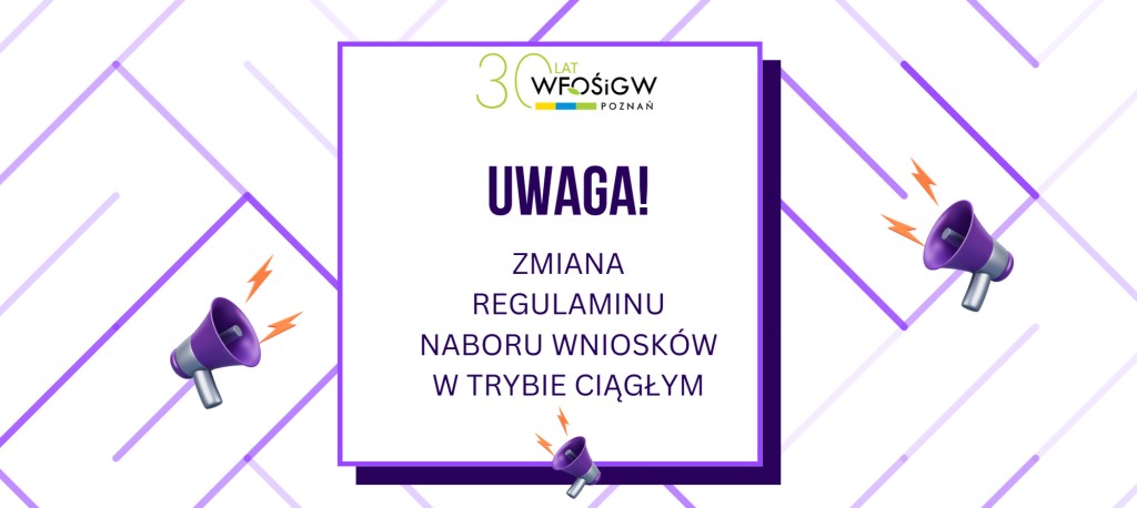 WFOŚiGW w Poznaniu informuje, iż z dniem 15.11.2023 r. będzie obowiązywał zmieniony Regulamin naboru wniosków w trybie ciągłym.