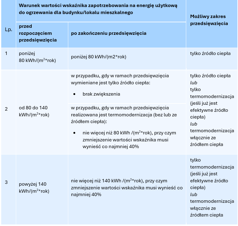 Możliwy do realizacji w ramach Programu zakres przedsięwzięcia uzależniony jest od standardu energetycznego budynku (wskaźnika zapotrzebowania na energię użytkową do ogrzewania) przed rozpoczęciem prac. Wprowadzony został również minimalny wymóg, który musi posiadać budynek po zakończeniu prac:
