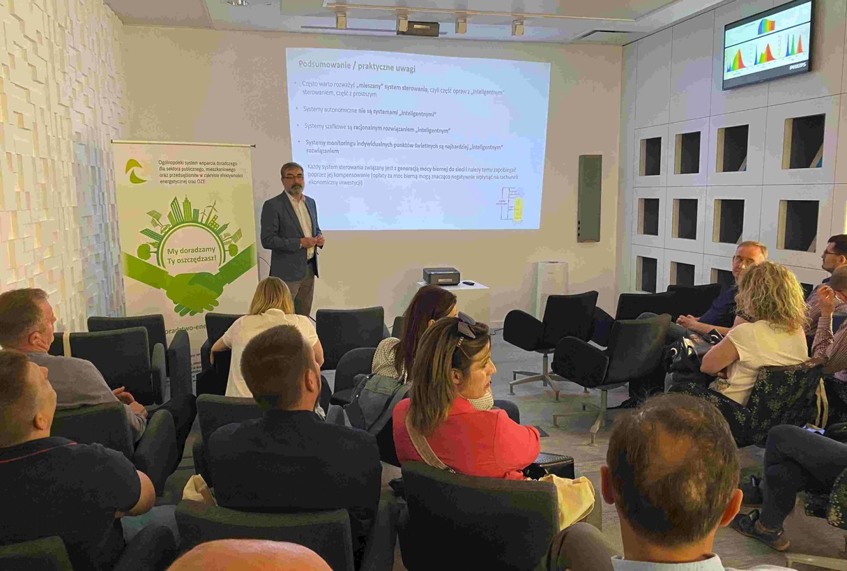 W dniach 17.05 oraz 23.05 odbyło się szkolenie warsztatowe dla Energetyków Gminnych, pn. „Oświetlenie uliczne”. Szkolenie skierowane było do osób – pracowników JST, którzy wcześniej ukończyli szkolenie podstawowe dla kandydatów na Energetyków Gminnych. Doradcy energetyczni WFOŚiGW w Poznaniu przeprowadzili szkolenie w dwóch etapach. Pierwsza część warsztatów odbyła się w formie online. Plan teoretycznej części szkolenia obejmował tematy związane z sytuacją prawną, parametrami oświetlenia ulicznego, realizacją inwestycji i ich formą finansowania czy też obliczeniami związanymi z oświetleniem ulicznym. Prezentacje przedstawili doradcy energetyczni Funduszu: Bartosz Iwanowski, Marek Korcz oraz Sebastian Wolff wraz z zaproszonymi gośćmi – ekspertami w dziedzinie oświetlenia, przedstawicielami Signify Poland Sp. z o.o. W drugiej części szkolenia, w dn. 23.05. uczestnicy mieli okazję zwiedzić obiekty Signify Poland Sp. z o.o. Na zaproszenie przedstawicieli spółki, energetycy gminni wraz z doradcami energetycznymi wielkopolskiego Funduszu zapoznali się ze szczegółami produkcji oświetlenia, a także odwiedzili nowoczesne Centrum Zastosowań Światła. Centrum zostało podzielone na kilka stref, z których każda prezentuje inne możliwości oświetleniowe. Uczestnicy szkolenia mogli przekonać się, jak działa światło oraz co można dzięki niemu osiągnąć.